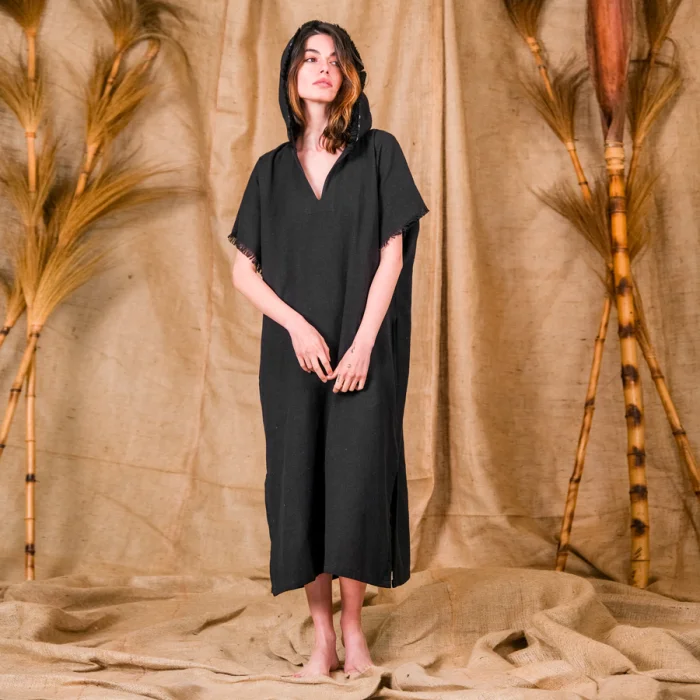 Ares, the longline kaftan with side slits and a hood. The cotton heavy, handwoven light-weight fabric is highly absorbent and dries quickly.