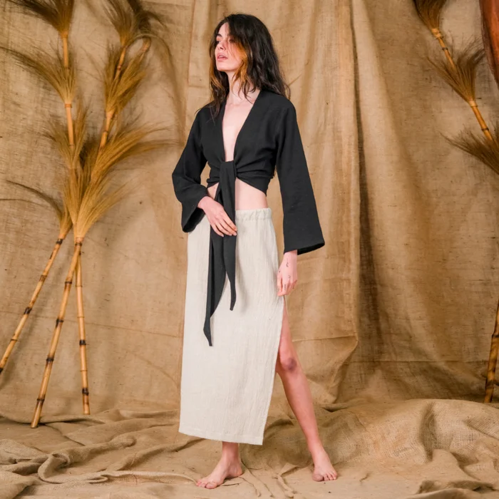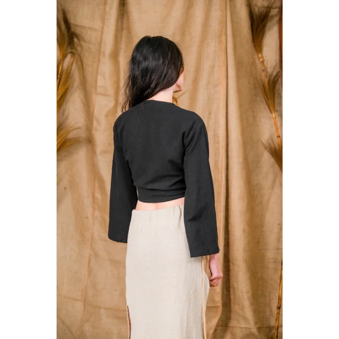 Esmeralda, the tie-front crop top with flute sleeves. The hand-loomed linen & cotton top, that embodies a natural and primitive look, invites your Goddess within. The beautiful lengthy ties gives you the option to tie the top from the front or the back depending on how you want to style your look. The model is also wearing the Aster Pant or Inej Skirt.