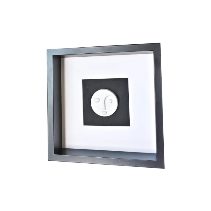 Abstract masks in a wooden frame. It can be hung on the wall or can stand on the table.