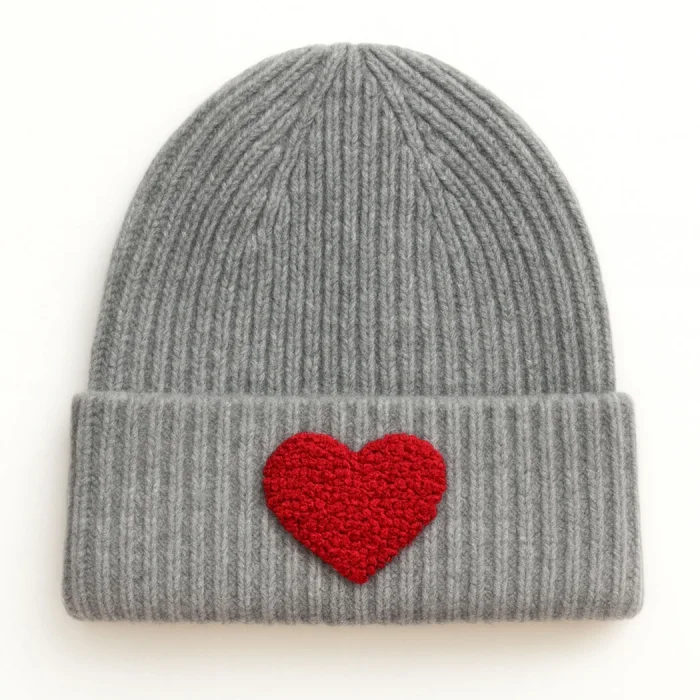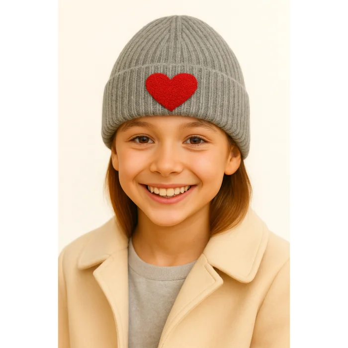 Product: Gray Wool Kids Beaniesi Red Glitter Heart Motif Punch-embroidery Detailed