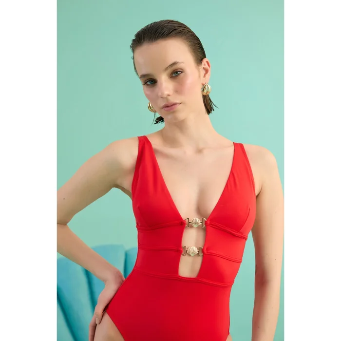 Product: Thalena Black Altin Deniz Kabuğu Aksesuarli V Yaka Pencereli Mayo