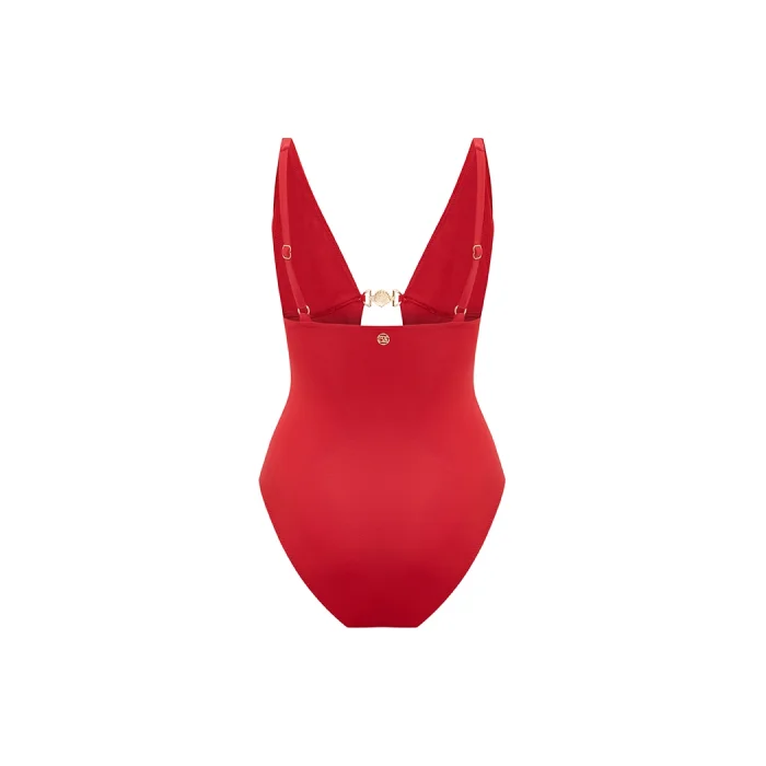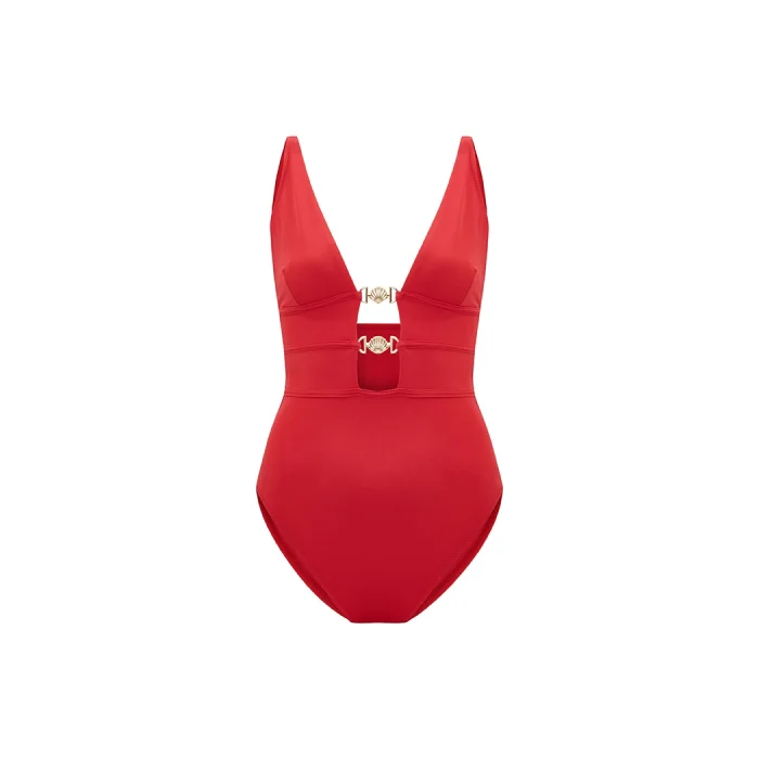 THALENA BLACK GOLD SHELL ACCESSORY V-NECK SWIMSUIT WITH WINDOW