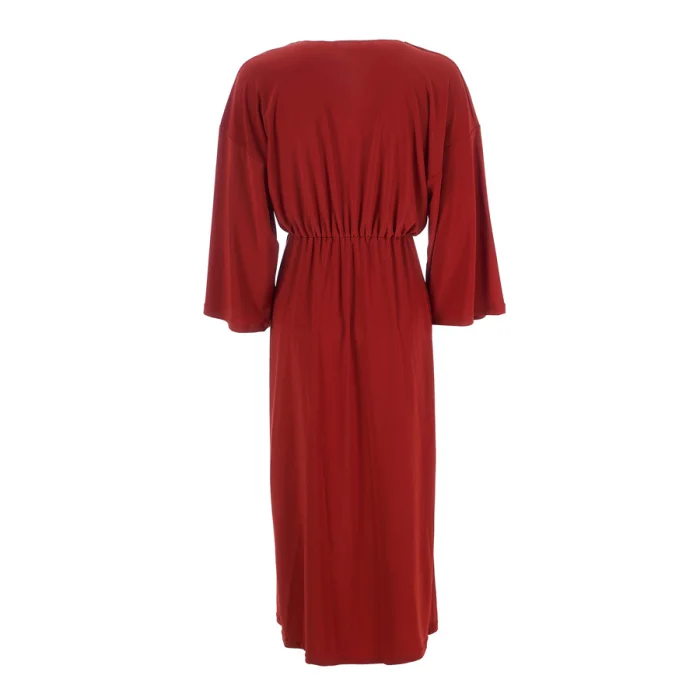Made from wrinkle-free fabric that comes out of her own C-ya bag, a dress with a deep V-neck, drape detail on the front, slit and bat sleeves.
