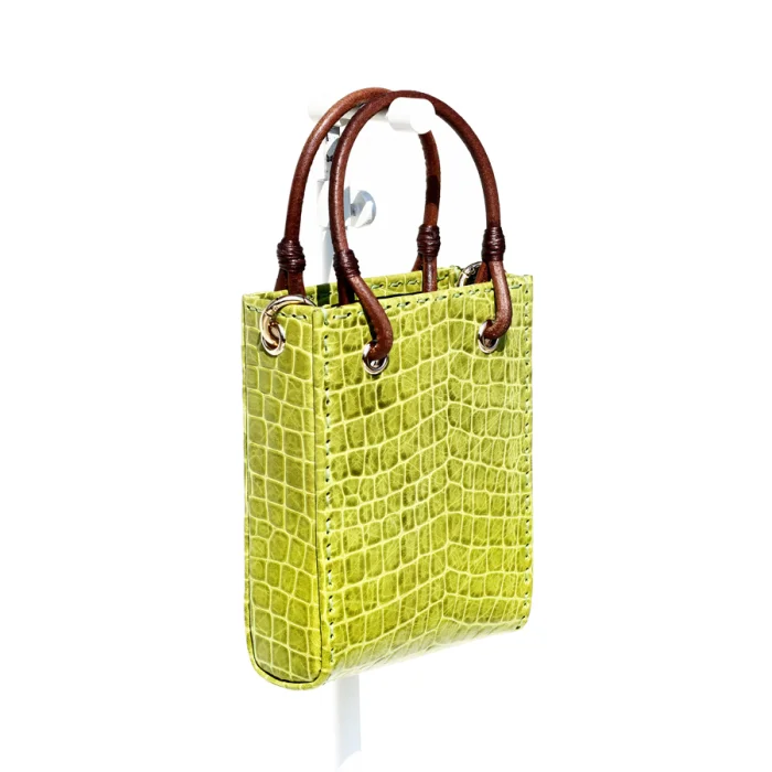 Hand stitched leather bag in croco embossed pistachio