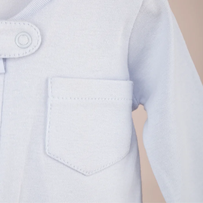 A stylish and functional option suitable for your baby's sensitive skin, the Double-Sided Zippered Booties-Free Baby Blue Jumpsuit with Pockets stands out with its elegant design and high-quality workmanship. It offers practicality in daily use and nobility on special occasions.