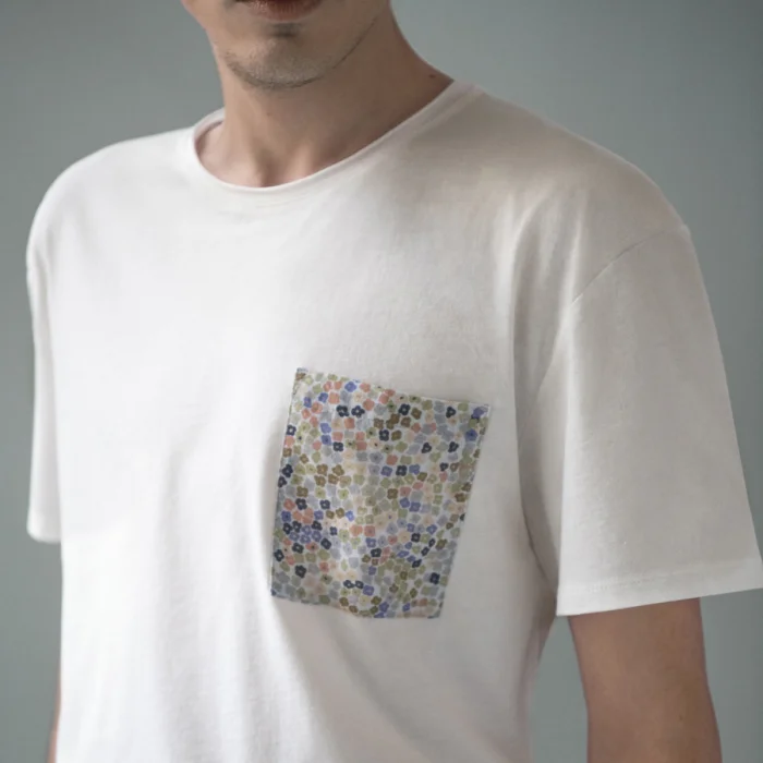 Linen pocket with floral print. Over size cut. Raw edge neck.
