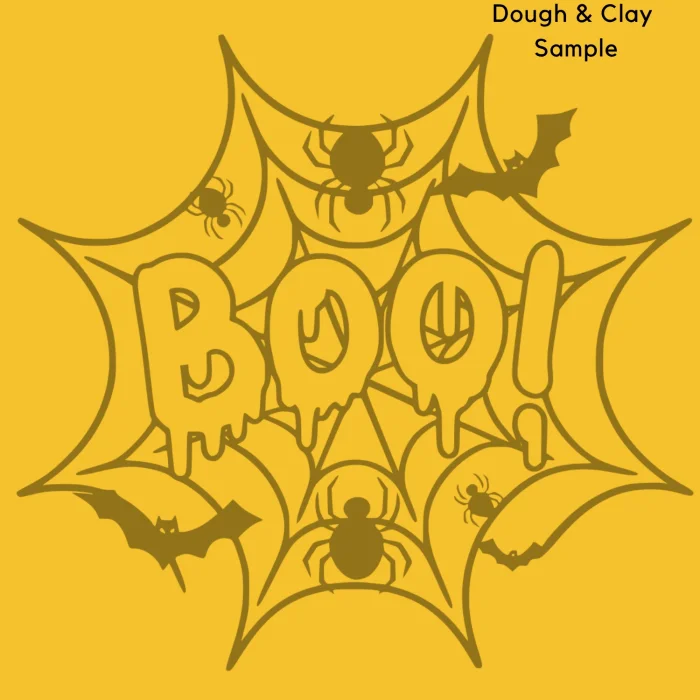 Halloween-themed “Boo” text with spider web, bats, and spider figures
