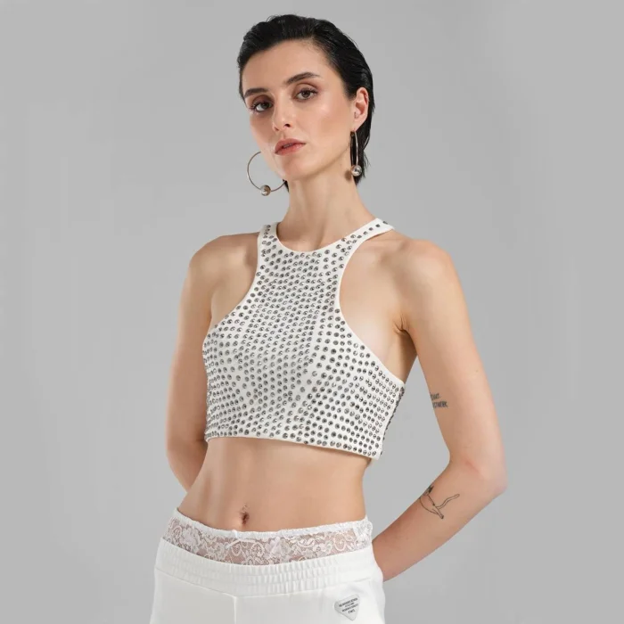 Standing out with its eye-catching details, the white barbell crop top with stone embroidery will add elegance to your elegance! Offering a sparkling look with its shiny stone decorations, this special design will attract all the attention at parties, invitations and special nights.