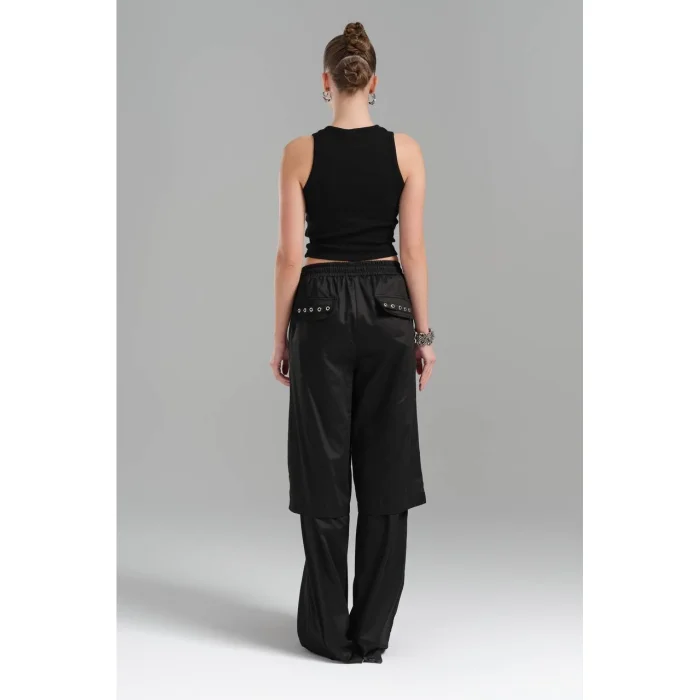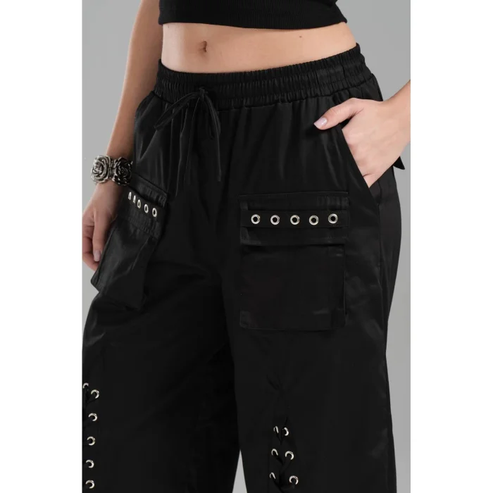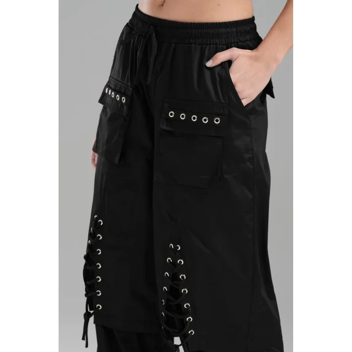 Offering daily elegance and comfort together, these black trousers are specially designed for stylish women. While it provides freedom of movement with its comfortable cut, it exhibits a sporty and original stance with its elastic waist structure with eyelet and lace details. It offers a functional alternative with its pocketed design and both stylish and sporty with its appearance.