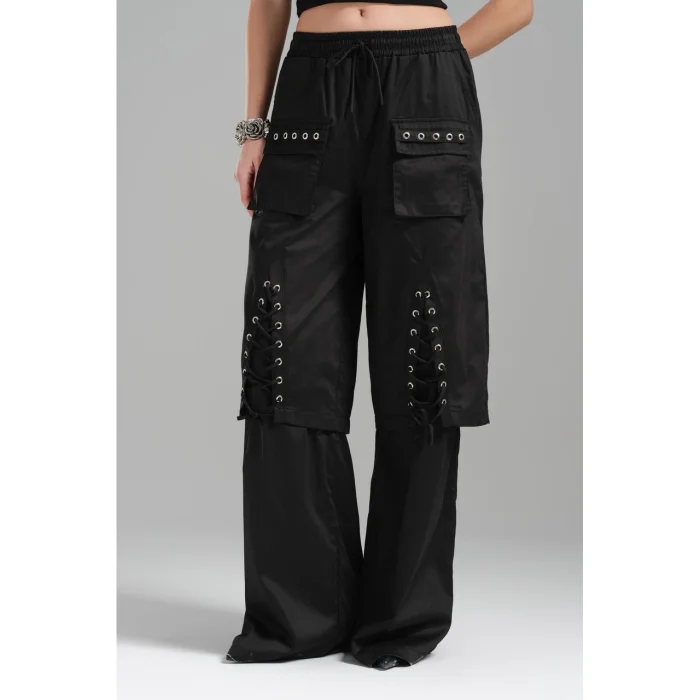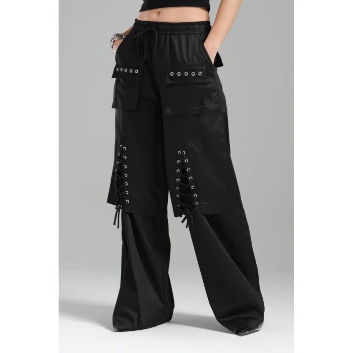 Black Relaxed Fit Women's Pants – Eyelet and Lace Detailed, Pockets, Boho Grunge Style