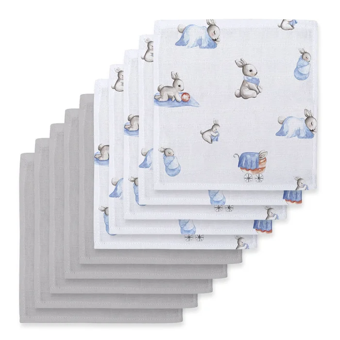 Life is now easier with our mouth cloths! You can use our life-saving 100% cotton muslin mouth cloths while feeding, breastfeeding or passing gas to your baby. You can easily carry it with you with its 10-packs. In this set, there are 5 Bebe Lapin and 5 Cotton Grey muslin mouth cloths. Its dimensions are also 20 x 20 cm. Discoloration and shrinkage that may occur after use and washing are caused by the nature of the cotton fabric. After a few washes, the cottoning will be finished. Returns due to shrinkage and normal level of cotton are not accepted.  The use of bleach is strongly discouraged in our muslins due to our sensitive textures and dyes, and it is recommended to use stain remover products based on their own prospectuses. Made in Turkey.