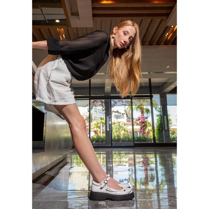 It combines the strong effect of minimalism and the striking elegance of black and white contrast with the Mary Jane loafer form. This model, which creates a striking style even in simple combinations with its 100% vegan structure and modern thick sole, complements the classic wrist band detail with a contemporary stance. Standing out with its nature-friendly production approach, Leave a Trail will allow you to leave a mark with your values as well as your style!