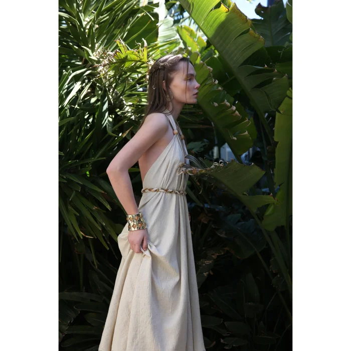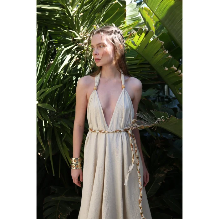 It is specially produced in the Eclectic workshop from wrinkled soft linen fabric. There is a deep V-neck décolleté at the front and back. It has a loose pattern. It is sold with a belt. Model size: 34 Model size: 175