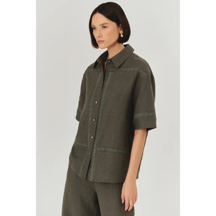 Product: Lace Detailed Comfortable Fit Pure Linen Short Sleeve Shirt
