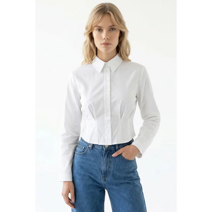 Offering a modern style with its shirt collar, long sleeves and crop cut, this white shirt will be a versatile addition to your wardrobe. Pleat details and regular cut complement your style both daily and in more special environments, offering both comfort and elegance. This design is a suitable option for those looking for comfortable use and eye-catching style. Designed with the clean look of white color and the modern lines of crop cut, this shirt can be easily combined with jeans, skirts or shorts. Its long sleeves allow it to be used comfortably in cool weather, while the shirt collar detail adds a classic atmosphere. Pleat details give the shirt a dynamic look and offer a different style. With this piece, you can achieve both a sporty and stylish look. This white crop shirt looks especially harmonious with high waist trousers and skirts. Thanks to its high-quality fabric, it offers comfort all day long while maintaining its stylish appearance. Its light and breathable structure will be preferred especially in spring and summer. It is a suitable choice for women who follow fashion trends. You can pair this shirt with blazers for office chic, jeans for weekend comfort, or a dressy skirt for a special dinner. While it offers freedom of movement thanks to its flexible structure and comfortable cut, it also adds a refined atmosphere to your style with its elegant details. This white shirt, which can easily match many pieces in your closet, combines elegance and modern design.