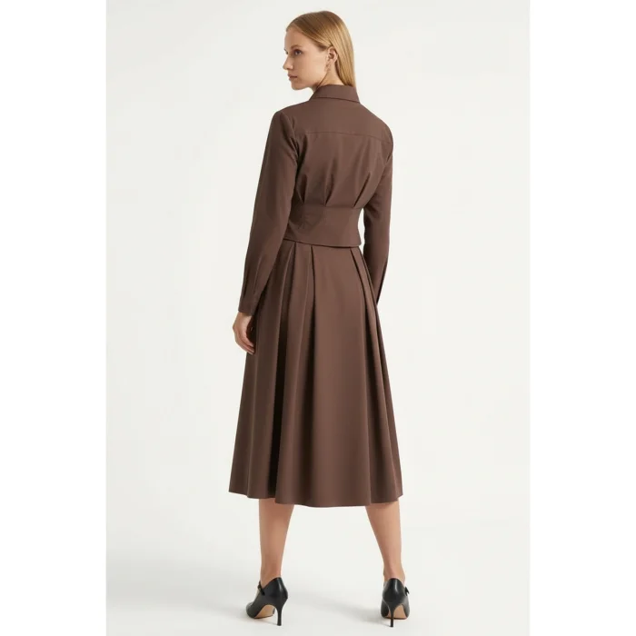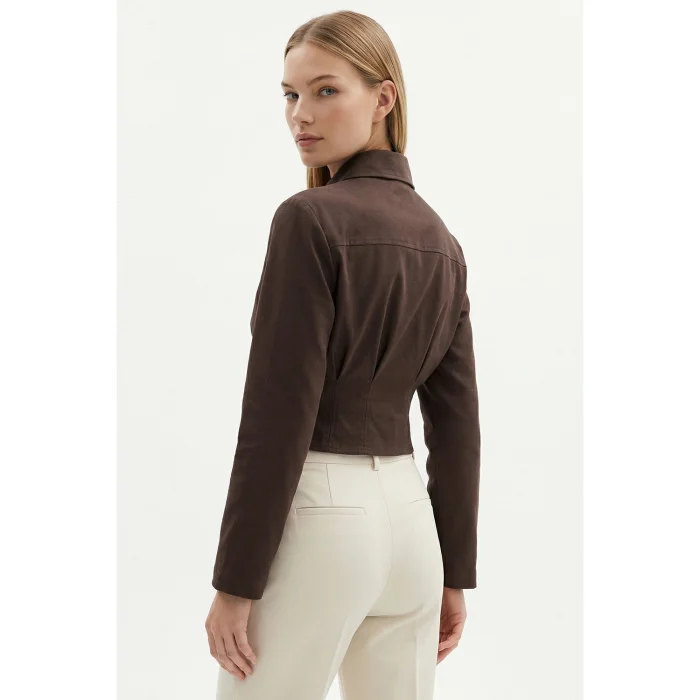 This sleek and modern coffee shirt will be an elegant and versatile addition to your wardrobe. With its shirt collar, long sleeves and crop cut, it offers both a classic and contemporary look. This model in our women's blouse collection is an ideal option for those looking for simplicity and elegance together. The regular fit cut provides comfortable wear without squeezing the body, while the crop length creates a modern silhouette. This brown shirt attracts attention with its wide usage area. You can create different styles by combining it with stylish trousers in the office environment or with your weekend jeans or skirts. Its appearance, especially complemented by white trousers, reveals how versatile this shirt can be used. Its long-sleeved design makes it suitable for use in cool weather, while its simple and minimalist lines easily match any accessory. One of the standout details of the shirt is the thin pleats on the collar. This detail adds an elegant touch to a classic shirt and adds originality to the overall look. Its buttoned front closure offers practical use while also reinforcing the classic shirt aesthetics. This crop blouse is designed to keep you comfortable and stylish all day long. It can be easily preferred both in your casual combinations during the day and in your elegance at night. Designed for stylish women, this brown crop shirt will take its place in your wardrobe as a timeless piece. This blouse, which has a light and comfortable fabric that you can easily carry on you, can accompany you in many different combinations. Reflect your style with this piece, which will be among the clothing preferences of the modern woman.