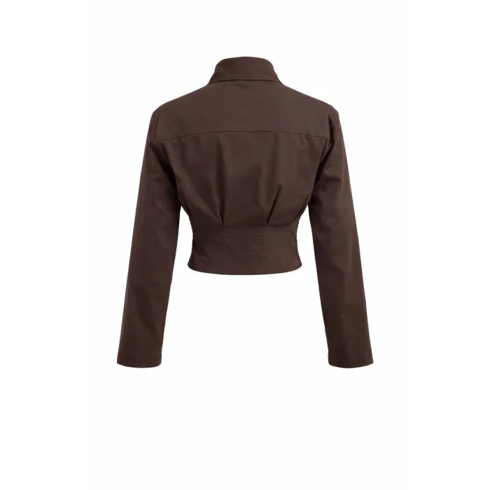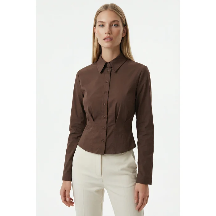 This sleek and modern coffee shirt will be an elegant and versatile addition to your wardrobe. With its shirt collar, long sleeves and crop cut, it offers both a classic and contemporary look. This model in our women's blouse collection is an ideal option for those looking for simplicity and elegance together. The regular fit cut provides comfortable wear without squeezing the body, while the crop length creates a modern silhouette. This brown shirt attracts attention with its wide usage area. You can create different styles by combining it with stylish trousers in the office environment or with your weekend jeans or skirts. Its appearance, especially complemented by white trousers, reveals how versatile this shirt can be used. Its long-sleeved design makes it suitable for use in cool weather, while its simple and minimalist lines easily match any accessory. One of the standout details of the shirt is the thin pleats on the collar. This detail adds an elegant touch to a classic shirt and adds originality to the overall look. Its buttoned front closure offers practical use while also reinforcing the classic shirt aesthetics. This crop blouse is designed to keep you comfortable and stylish all day long. It can be easily preferred both in your casual combinations during the day and in your elegance at night. Designed for stylish women, this brown crop shirt will take its place in your wardrobe as a timeless piece. This blouse, which has a light and comfortable fabric that you can easily carry on you, can accompany you in many different combinations. Reflect your style with this piece, which will be among the clothing preferences of the modern woman.