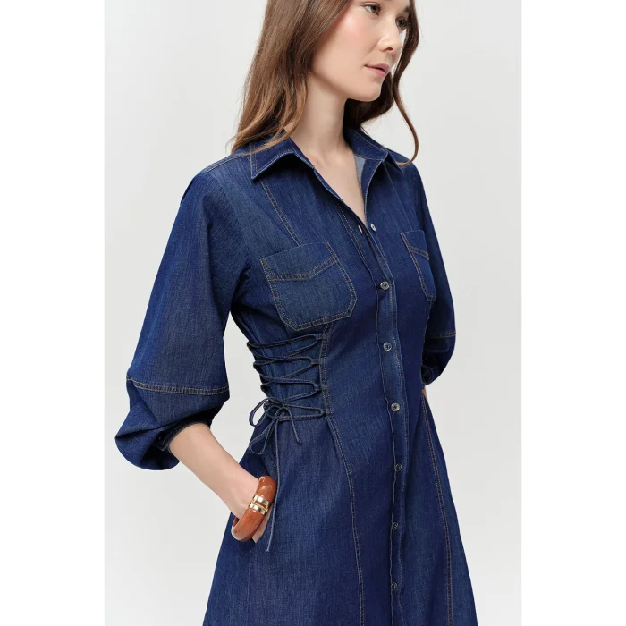 long-sleeved, button-down regular-cut midi blue dress with ties on the sides is designed to add a touch of modern elegance to your wardrobe. The durability and timeless appearance of denim fabric, blended with contemporary details, offer a suitable option for many occasions. This dress, which allows you to look stylish without sacrificing your comfort in daily use, will be one of the preferred pieces of your wardrobe. Quality denim, the main material of this dress, promises both long-lasting and comfortable use. The classic blue tone adapts to every season and offers a timeless style. The lacing details on the sides of the dress add a unique atmosphere to the design and at the same time help to provide a better fit for your body. This detail adds a lively and feminine touch to the dress. The buttons on the front and the classic collar design give the dress a sophisticated look. It offers practicality with its structure suitable for use in different environments and combinations. It has an elegant finish with its long sleeves, slightly voluminous detail on the shoulders and buttons on the cuffs, which completes the style by adding both a modern and classic atmosphere to the dress. The midi length cut, which ends slightly below knee level, offers both comfort and elegance together. This length, which is suitable for women of a wide age range, allows you to display an elegant stance without restricting your freedom of movement. Additionally, two chest pockets offer a practical solution for carrying your small items, adding functionality to the design and adding a sporty touch to your style. This versatile denim dress can easily take on a variety of styles with different accessories and shoes. Pair it with tan-colored heeled sandals and an elegant bracelet for a comfortable and stylish look on your weekend outings or shopping in the city. You can create a more casual office or casual look with white sneakers or flat-soled loafers. You can also use this dress for special occasions or stylish meetings by choosing your accessories more assertively and complementing them with high heels. Lacing on the sides will add a sophisticated detail to the dress. The regular midi blue dress with ties on the sides, long sleeves and buttons can be included in the wardrobes of many women as both a comfortable and stylish piece. With its durable denim fabric and elegant design, it will be a clothing option that you can use with pleasure for many years.