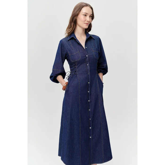 long-sleeved, button-down regular-cut midi blue dress with ties on the sides is designed to add a touch of modern elegance to your wardrobe. The durability and timeless appearance of denim fabric, blended with contemporary details, offer a suitable option for many occasions. This dress, which allows you to look stylish without sacrificing your comfort in daily use, will be one of the preferred pieces of your wardrobe. Quality denim, the main material of this dress, promises both long-lasting and comfortable use. The classic blue tone adapts to every season and offers a timeless style. The lacing details on the sides of the dress add a unique atmosphere to the design and at the same time help to provide a better fit for your body. This detail adds a lively and feminine touch to the dress. The buttons on the front and the classic collar design give the dress a sophisticated look. It offers practicality with its structure suitable for use in different environments and combinations. It has an elegant finish with its long sleeves, slightly voluminous detail on the shoulders and buttons on the cuffs, which completes the style by adding both a modern and classic atmosphere to the dress. The midi length cut, which ends slightly below knee level, offers both comfort and elegance together. This length, which is suitable for women of a wide age range, allows you to display an elegant stance without restricting your freedom of movement. Additionally, two chest pockets offer a practical solution for carrying your small items, adding functionality to the design and adding a sporty touch to your style. This versatile denim dress can easily take on a variety of styles with different accessories and shoes. Pair it with tan-colored heeled sandals and an elegant bracelet for a comfortable and stylish look on your weekend outings or shopping in the city. You can create a more casual office or casual look with white sneakers or flat-soled loafers. You can also use this dress for special occasions or stylish meetings by choosing your accessories more assertively and complementing them with high heels. Lacing on the sides will add a sophisticated detail to the dress. The regular midi blue dress with ties on the sides, long sleeves and buttons can be included in the wardrobes of many women as both a comfortable and stylish piece. With its durable denim fabric and elegant design, it will be a clothing option that you can use with pleasure for many years.