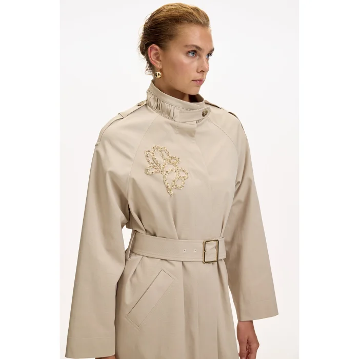 Stone Embroidered Stand-up Collar Belted Regular Trench Coat