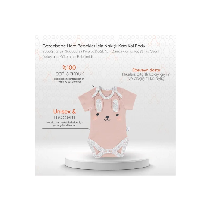 Product Description:Gezenbebe Hero Embroidered Short Sleeve Body for Babies: Carefully Crafted for Your Baby's Delicate Skin - With Gezenbebe's Signature Pattern, Beloved Mascots and Exquisite Embroidery Details! The perfect choice for your baby's sensitive skin: Featuring Gezenbebe's iconic patterns, Elephant, Koala, Teddy Bear and Rabbit mascots, as well as fine embroidery details, this bodysuit completes your baby's clothing collection. Highlights:GEZENBEBE'S UNIQUE DESIGN: Not just a baby bodysuit, but a style statement with Gezenbebe's original, exquisite patterns and exquisite embroidery. PURE COTTON COMFORT: Made of 100% breathable cotton, the Hero Embroidered Short Sleeve Body offers the softest touch to your baby's skin.SIGNATURE PATTERN, BELOVED MASCOTS & ELEGANT EMBROIDERY: This bodysuit makes a difference in your baby's wardrobe with Gezenbebe's unique design, her beloved mascots Elephant, Koala, Teddy Bear and Rabbit, as well as fine embroidery details. UNISEX AND MODERN: It is designed for both girls and boys and draws attention with its fashionable patterns. USER-FRIENDLY: Offers easy wearing and replacement with its nickel-free snap design. PERFECTION IN EVERY DETAIL FOR YOU: We care about customer feedback and are constantly improving our products to make them perfect with comfort, fit and quality. Technical Details:Size Options: Newborn, 0-3 months, 3-6 months, 6-9 months, 9-12 months, 12-18 months. Color Options: Bunny, Elephant, Koala, Teddy (Organic)Please carefully review the size and color options before ordering. The Gezenbebe Hero Embroidered Short Sleeve Body collection for Babies is not only an outfit for your baby, but also the perfect combination of comfort, style and elaborate details. Make every moment of your baby's life!
