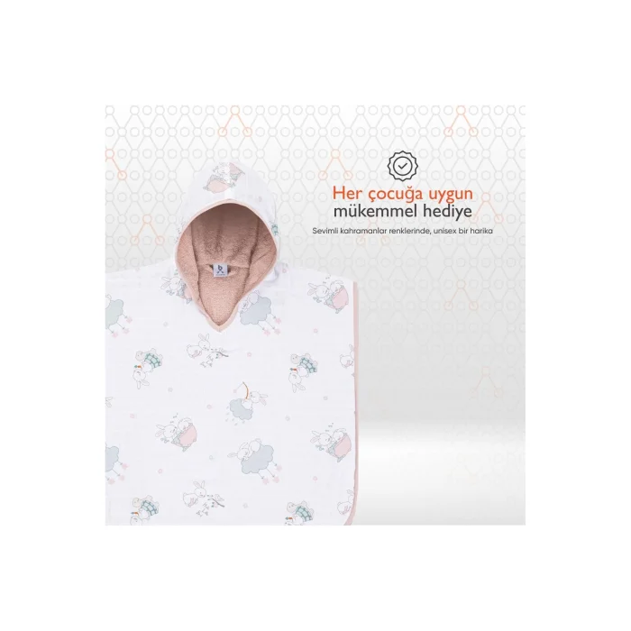 Product Description: Gezenbebe Hero Patterned Muslin & Terry Baby Children's Poncho: In the Warmth of Heroes, in the Comfort of Naturalness! Not only a poncho for your little hero, but also an adventure companion: Gezenbebe Hero Patterned Muslin & Terry Poncho! This special product, which will be with your baby in its joyful moments, meets the unique patterns of Gezenbebe's iconic Elephant, Koala, Teddy Bear and Rabbit heroes. The terry cloth on the inner surface touching the skin offers a unique combination of comfort and elegance by wrapping your baby with its softness and natural warmth. Now, are you ready to embark on new adventures with your little hero? Prominent Features:GEZENBEBE ORIGINALITY:Show your style with Gezenbebe's unique heroes. HIGH QUALITY FABRIC: Hero Patterned Muslin & Terry Poncho guarantees your baby's comfort with its breathability and ultra-softness. YOUR ICON: Its cute and unique pattern soothes your baby's mood while also adding originality to it. MULTIFUNCTIONAL USE: Not only ideal for daily use, but also for beach and after-pool. SPECIAL FOR SENSITIVE SKIN: With its hypoallergenic properties and easy washability, it is suitable for all skin types, especially ideal for babies with sensitive skin. IDEAL AS A GIFT: With its colorful, cute and unisex design, it is the perfect gift option for all babies. NATURAL DYE: Natural and harmless water-based dyes are preferred in prints. ALWAYS THE BEST FOR YOU: Customer satisfaction is at the forefront for us. With your feedback, we are constantly improving our products and striving for excellence. Technical Details:High Quality Material: Made with premium materials that are lightweight, breathable and quick-drying. Baby Friendly: With its 100% cottony texture, it provides maximum comfort and dryness for your baby's sensitive skin. Usage Time: Our ponchos will be a companion that will not leave your baby's side until the age of 5. Unique Color Options: With attractive color and pattern alternatives such as Bunny, Elephant, Koala and Teddy. Care Instructions: Wash at 30 degrees and dry without exposing to direct sunlight. Add innovation to both your baby's comfort and your style with Gezenbebe Muslin Poncho. This special product, which knows no limits in quality and comfort, is designed for parents looking for the best for your baby.