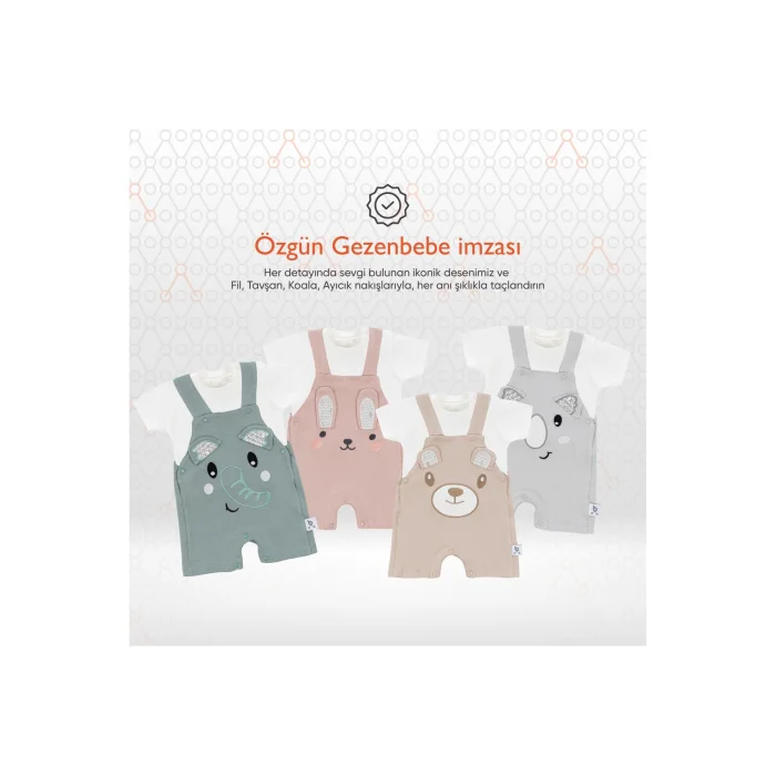 Product Description:Gezenbebe Hero Short Sleeve Baby T-Shirt & Embroidered Salopet Set: Style and Comfort in Perfect Harmony! With the highest level of comfort offered to your baby's delicate skin, make him feel the quality of Gezenbebe. The exquisite embroidery details of Gezenbebe's unique heroes, the Elephant, Koala, Teddy Bear and Rabbit, gently wrap around your baby's skin, making him both stylish and comfortable. Standout Features:GEZENBEBE'S UNIQUE DESIGN: This set offers more than just a Baby T-Shirt & Embroidered Salopet Set; It is a fashion statement of Gezenbebe with its special patterns and detailed embroidery. MEET THE SOFTNESS: With the unique softness offered by the 100% breathable cotton fabric, your baby's skin meets its most comfortable form. UNIQUE GEZENBEBE SIGNATURE: Thanks to our iconic designs and cute mascots, your baby will feel comfortable and look stylish. PLAYFUL AND MODERN: With modern and fun design details, your baby's energy will never be lost. UNISEX ELEGANCE: With its fashionable patterns, your baby feels ready in every sense. EASY TO USE: Nickel-free snap buttons offer quick and convenient use. LIVE QUALITY: We value customer feedback and continuously improve our products for the best. Technical Details:Size Options: 0-3 months, 3-6 months, 6-9 monthsColor Options: Bunny, Elephant, Koala, Teddy (Organic). Review the size chart before completing the order. Make every moment of your baby's life precious with Gezenbebe. Its comfort and elegance are important to us. Feel that we are with your baby with this set that will make every day special!