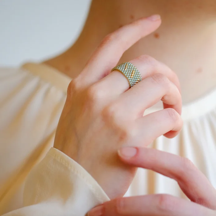 Rings are handsewn with glass beads. It is pretty robust and will not be damaged unless it is forced. It is not flexible and does not stretch much over time. There is no harm in contact with water.