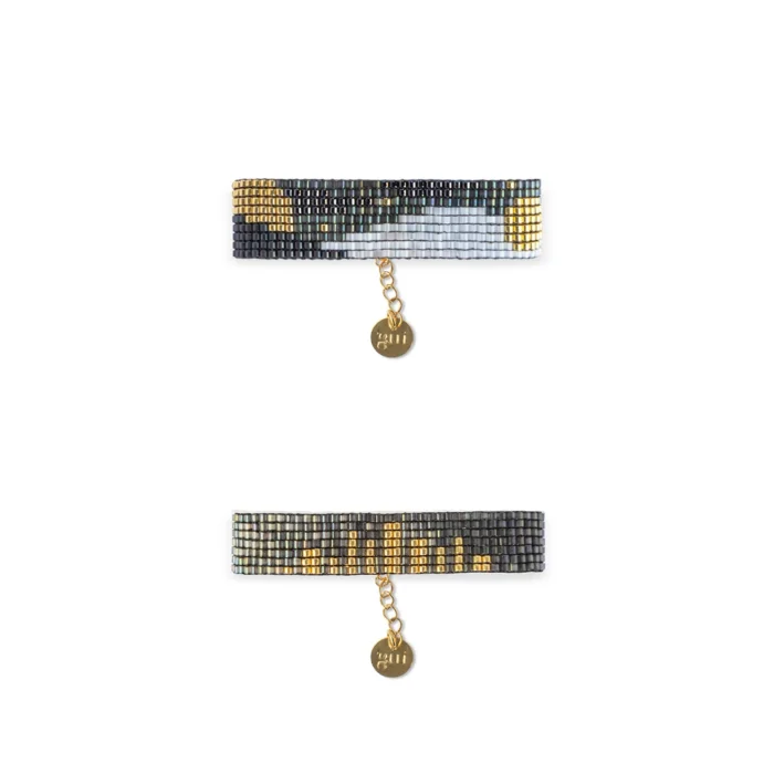 Sun & Moon bracelet is handsewn by using glass beads. Each piece is carefully crafted by our skilled artisans, to reach the utmost handmade quality. The metal parts of the bracelet are made of brass plated with 18 karat gold. The bracelets adapt to different wrist thicknesses with the end chain. Bracelet thickness: 1,5cm