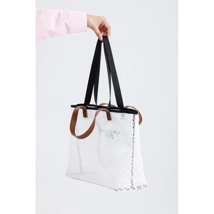 Featuring a sleek white lace pattern fabric and waterproof PVC coating, this oversized beach and shopping bag is ideal for both everyday use and summer activities. Thanks to its large inner volume, inner pocket and two different handle lengths, it can be used both as a shoulder and as a handbag. With its durable structure and aesthetic design, it reflects your style in any environment. Dimensions: 58x35x18 cm.