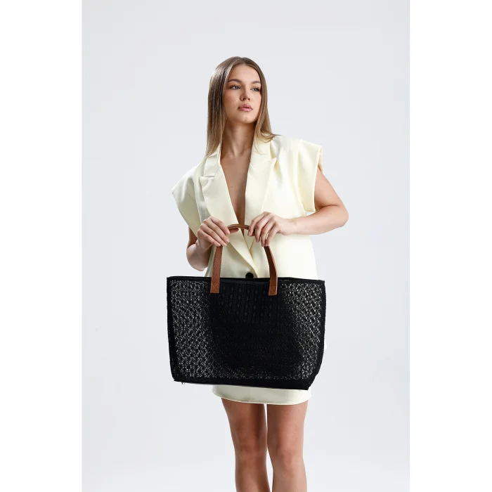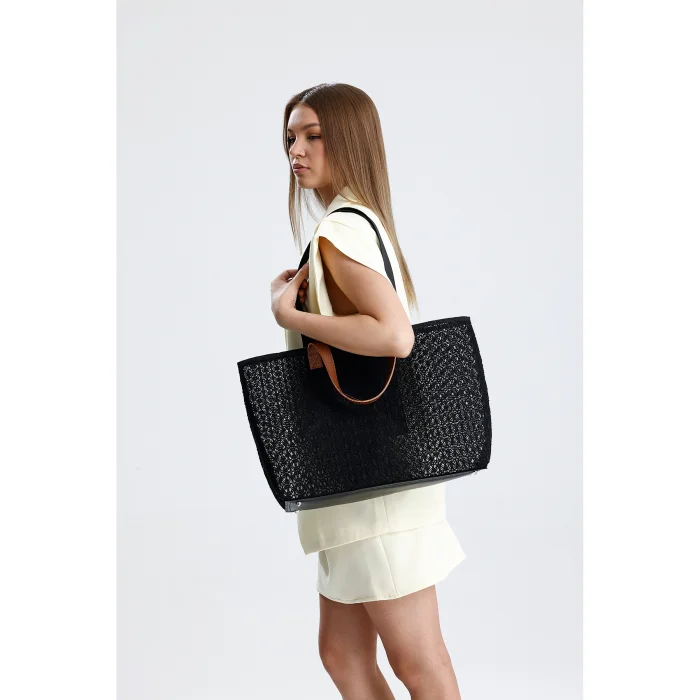 Featuring a sleek white lace pattern fabric and waterproof PVC coating, this oversized beach and shopping bag is ideal for both everyday use and summer activities. Thanks to its large inner volume, inner pocket and two different handle lengths, it can be used both as a shoulder and as a handbag. With its durable structure and aesthetic design, it reflects your style in any environment. Dimensions: 58x35x18 cm.