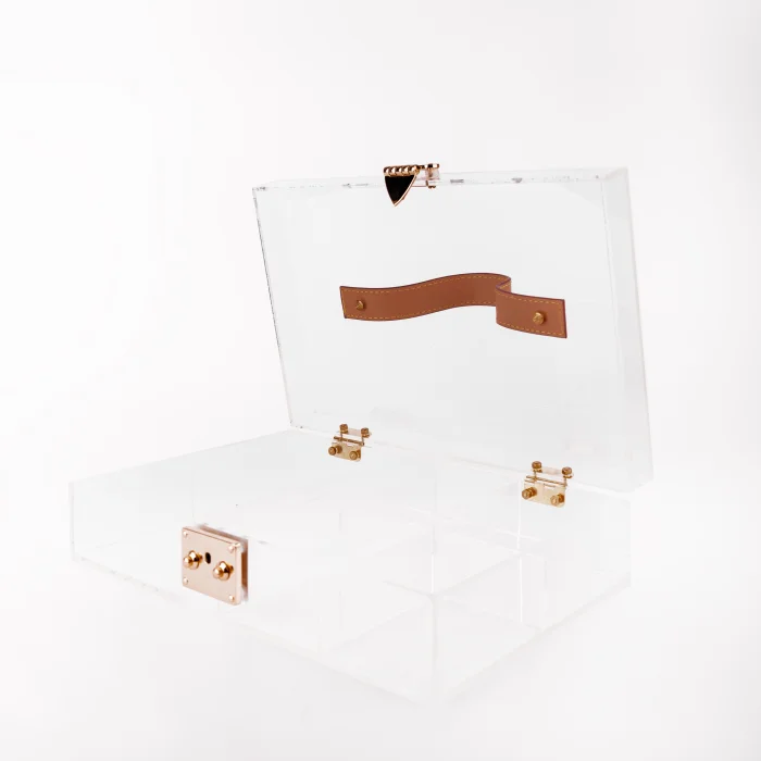 Stylish, acrylic, stainless accessories and lock mechanism, leather handle, handmade, designer jewelry and make-up bag