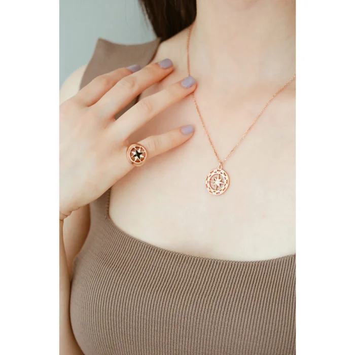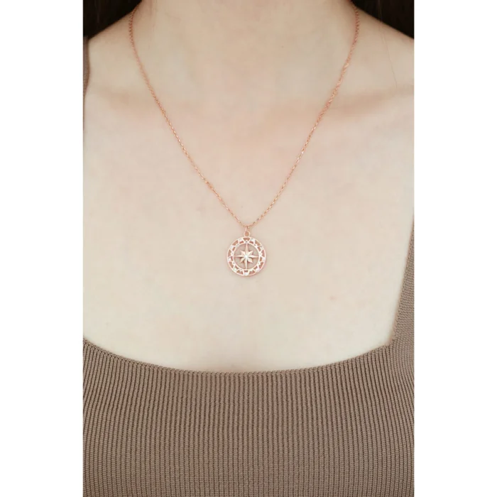 925 Sterling Silver - 14 carat rose gold-plating North & Polestar Medallion Necklage with white gem detail.