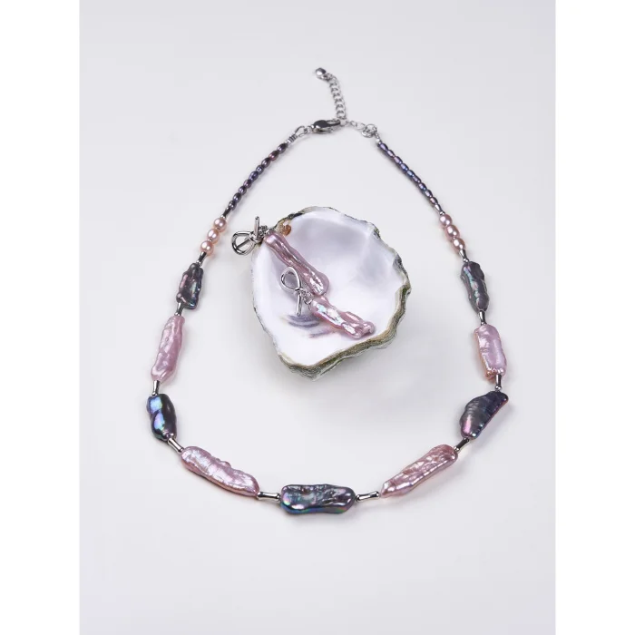 Elegantly minimalist yet undeniably bold: elongated pastel-pink and deep black stick pearls alternate along a sleek silver chain, with matching earrings sculpted in the same palette. The interplay of soft pastels and midnight tones creates visual tension that feels both modern and surprisingly romantic. Perfect symmetry meets refined rebellion.