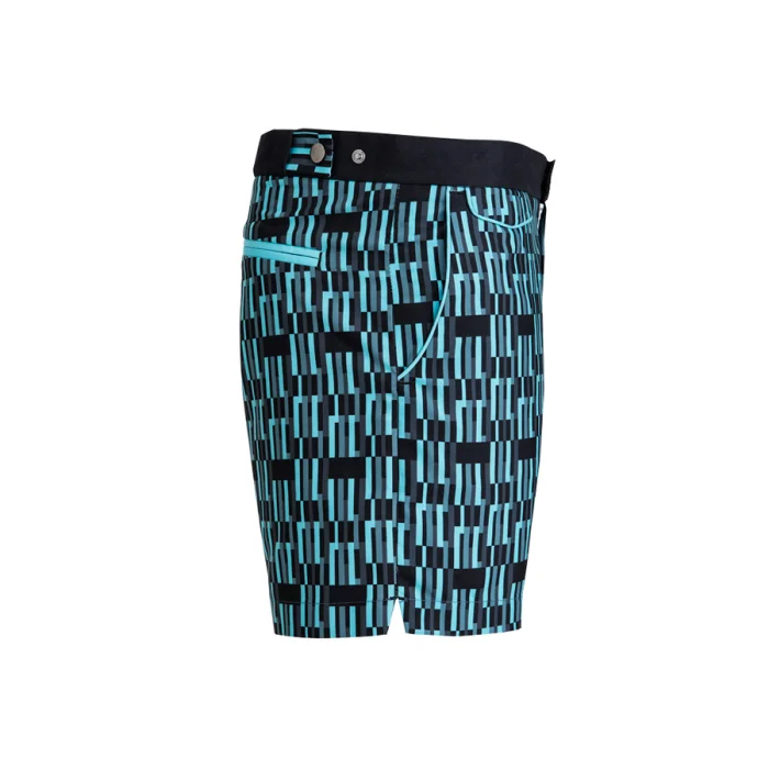 Adjustable side fasteners, bias along side pockets, fleted back pocket, slim fit swimshort