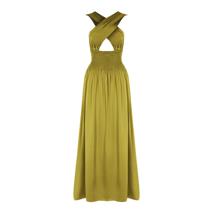 •Smocked waist, criss cross halter neck dress. •Maxi dress can be tied to neck or buttoned to back with crossing the straps. •Silky soft vegan fabric.