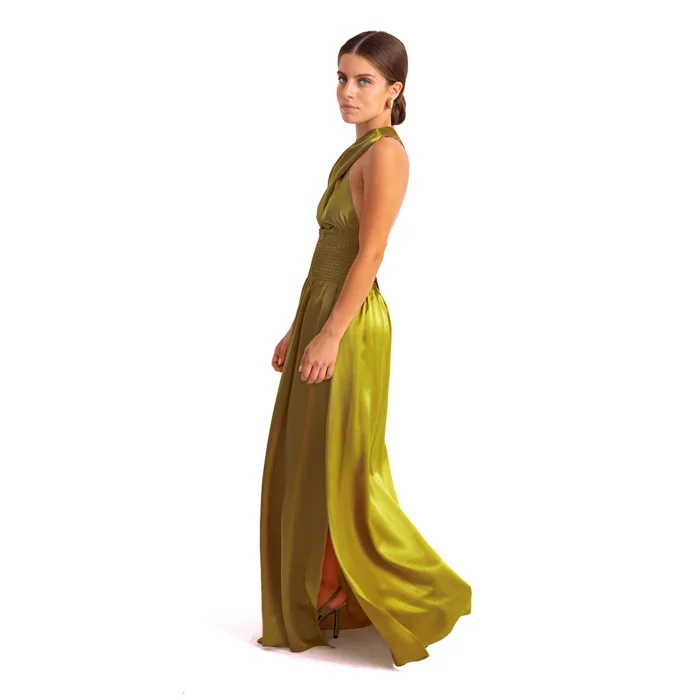 •Smocked waist, criss cross halter neck dress. •Maxi dress can be tied to neck or buttoned to back with crossing the straps. •Silky soft vegan fabric.