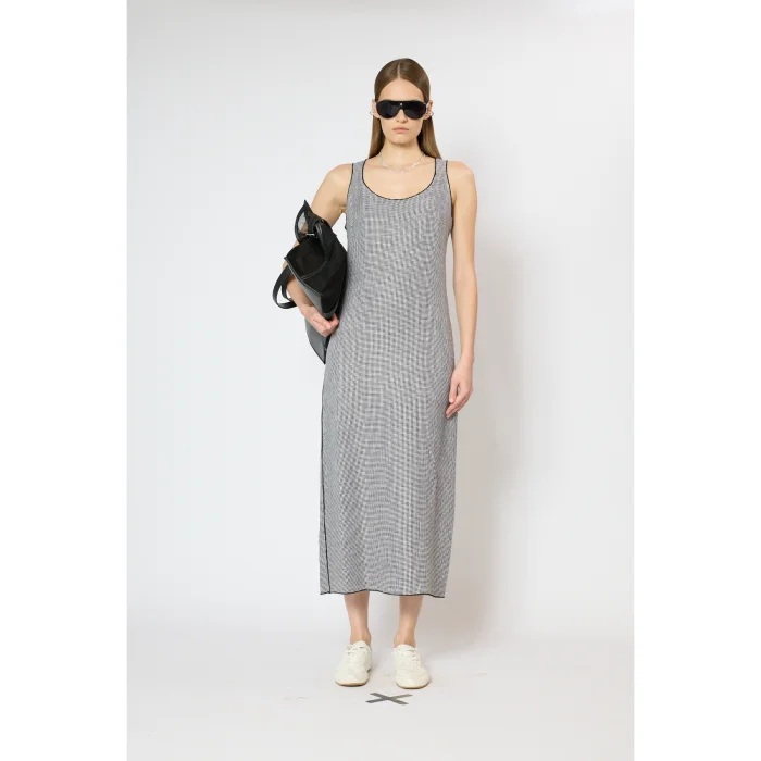 Fabric: Linen-cotton blend main fabric Volume: Flat form, tank top neck, slit at the back Length: Maxi Detail: Baby overlocks on the edges, cord arch