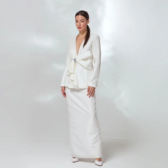 A white jacket and skirt set featuring a ribbon detail embellished with stones.