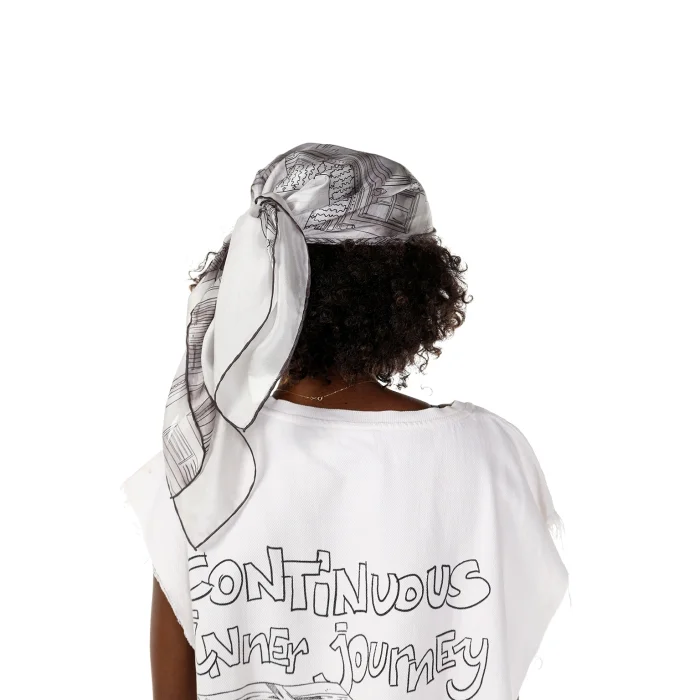 Color : Black & White Fabric : 100% Vegan Silk Size: 90x90cm Summer is fresh silk. Its edges are sewn by hand. The patterns are hand-drawn and digitally colored. Shipped in special boxes. Only dry cleaning is recommended. Limited edition.