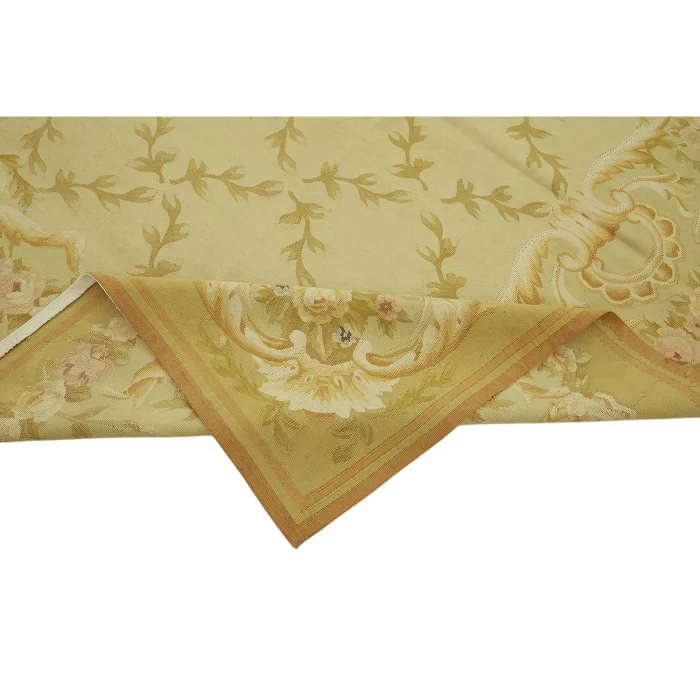 The Aubusson Rug is 239 cm wide by 300 cm long and about 5 mm thick. It weighs an average of 8 kg. It is made with hand-spun wool and cotton. It takes its colors from root dyes obtained naturally.