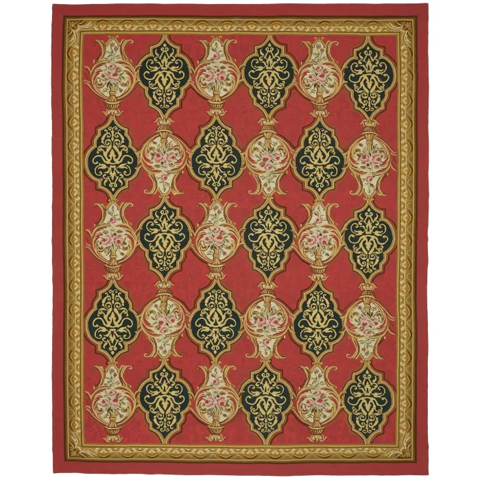 The Aubusson Rug is 272 cm wide by 346 cm long and about 5 mm thick. It weighs an average of 10 kg. It is made with hand-spun wool and cotton. It takes its colors from root dyes obtained naturally.