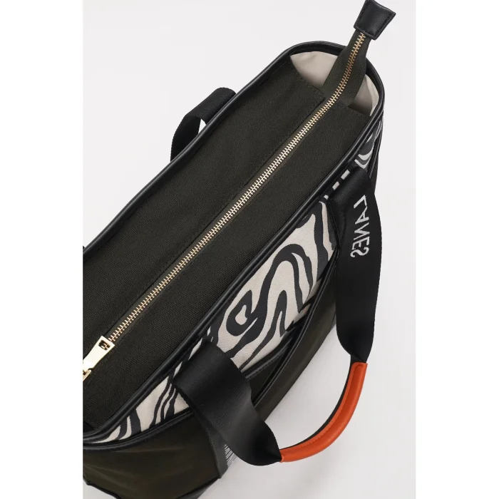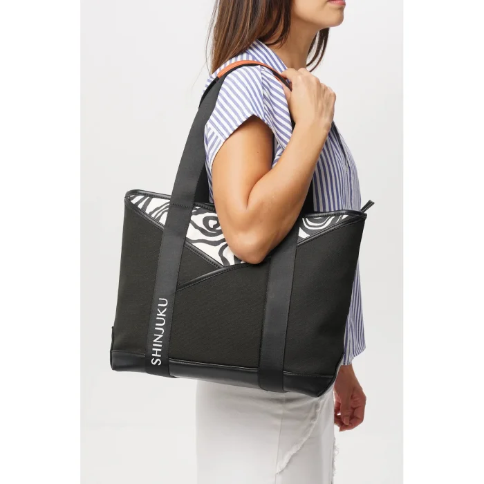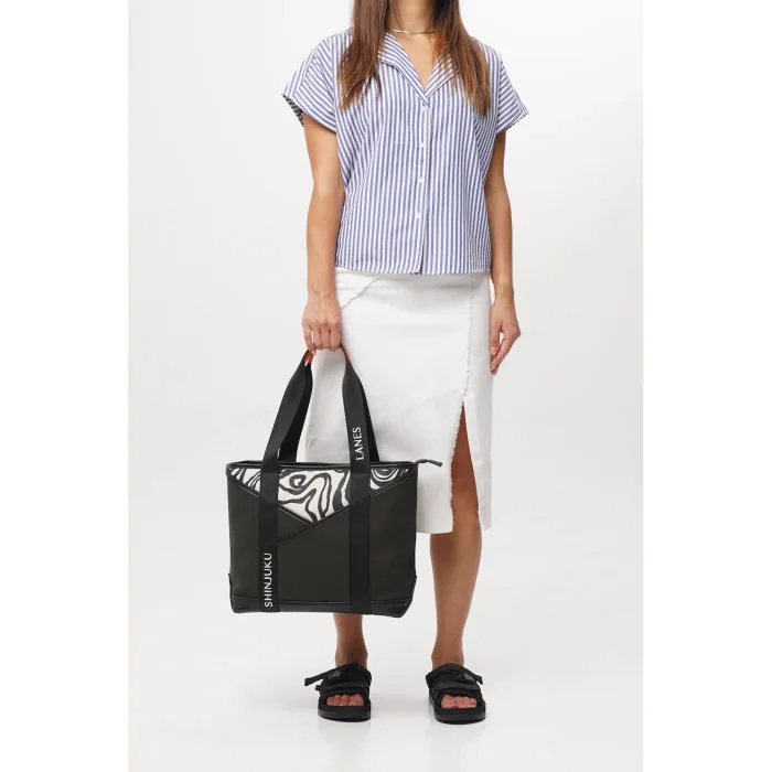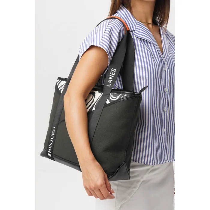 The perfect blend of style and functionality, the Origami Pocket Tote is a spacious bag with a striking, modern design. Crafted from recycled materials, it has a unique front pocket with overlapping folds inspired by traditional Japanese origami. Behind this front pocket is an abstract 'terrain print' evocative of mountain topography. Key features Sustainable: Crafted from recycled cotton canvas and recycled vegan leather Spacious: Comfortably fits a 14" laptop Durable: Strong recycled nylon straps ft. contrasting orange handles Protected: PFC-free nano-coating for water resistance and stain prevention Fully lined: 100% organic cotton lining Multiple pockets: Double front pocket, internal zip pocket and two slip pockets Giftable: Arrives in a Shinjuku Lanes dust bag, made from organic cotton Available in three colours (Natural, Black, Khaki Green).Product: Origami Pocket Tote - Black Terrain Print