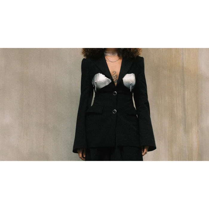 A wool-viscose blend, ceramic-chest and nipple-shaped chain in a waist-fitting black blazer.