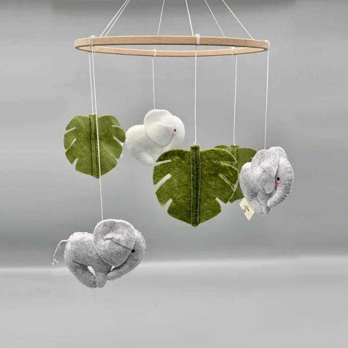 This revolving model, which consists of elephant figures made of felt and decorative leaves, will easily adapt to many rooms with its natural color tones.