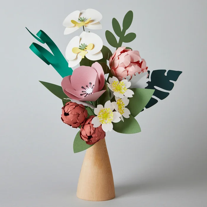 Measurements Diameter of the bouquet: approximately 8″ (20 cm) Height in total: 10.5″ (27 cm) Height of the vase: 4.5″ (11cm) Materials The paper we choose to work with is 160-300 gsm. The paper pulp is the same color as the surface, so the line along the cuts are not white. The vases come from local forests and are shaped by our local carpenter. Sustainability Compared to other materials, wood and paper based goods produced in a sustainable manner are more environment-friendly. They come from a renewable resource and are recyclable. Also the papers we use are FSC, PEFC and ECF certified, coming from environmentally conscious, sustainable forests. Why prefer our paper flowers? Our paper flower bouquets are long lasting and unique gifts for yourself and your loved ones. These artisanal bouquets are everlasting gifts for mother’s day, birthday, valentine’s day, anniversary, housewarming or a new job celebration. It is also the perfect gift for allergy sufferers or get well soon flowers for patients and newborns in hospitals. Paper flowers are also an eco friendly and easy maintenance choice compared to fresh flowers. How do we do it? Every single detail is designed by A! Ne Hoş team. The templates, paper flowers and wooden vases are designed by A! Ne Hoş. All the flowers are hand made, attached to wire and gathered as a bouquet with floral tape. We collaborate with women who have to stay home to take care of their children. Thus, they have a chance to earn money by working from home.