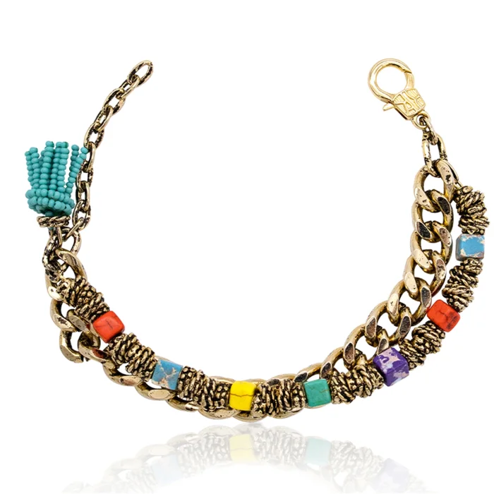 Production Type: Handmade Bracelet Material: Havlite stone, 22 carat gold-plated brass, Indian tassel Length: 17 cm + 5 cm extension chain