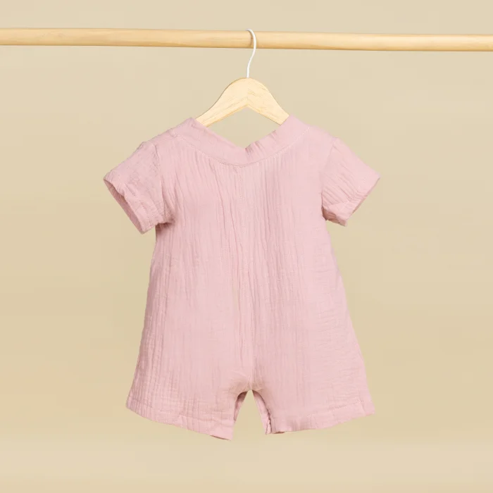 Muslin short-sleeved kimono baby romper is made of 100% organic cotton, with your baby's comfort and convenience in mind. Thanks to its natural and breathable muslin fabric, it provides a soft touch to your baby's skin and prevents sweating. Perfect for sensitive skin, this jumpsuit ensures your baby stays cool and comfortable all day long. Its lightweight structure is designed to keep your baby comfortable, especially on hot days.
