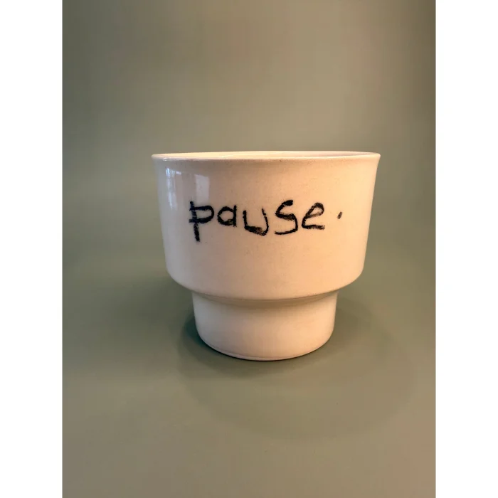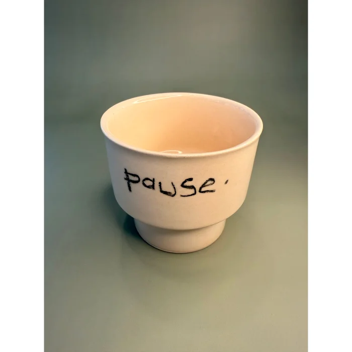 This handmade ceramic mug features the handwritten word “Pause” — a simple yet powerful reminder to slow down, take a break, and be present in the moment.