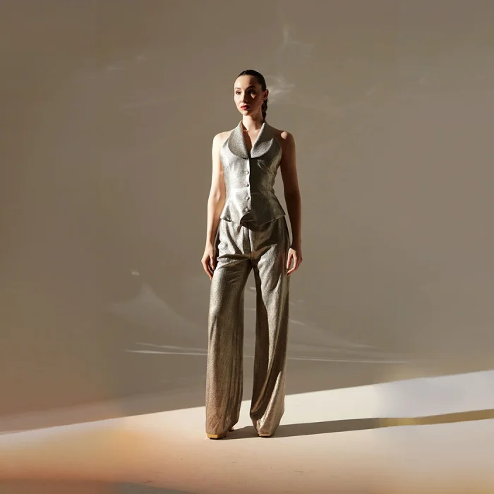 A shiny vest and trousers set featuring a shawl collar.